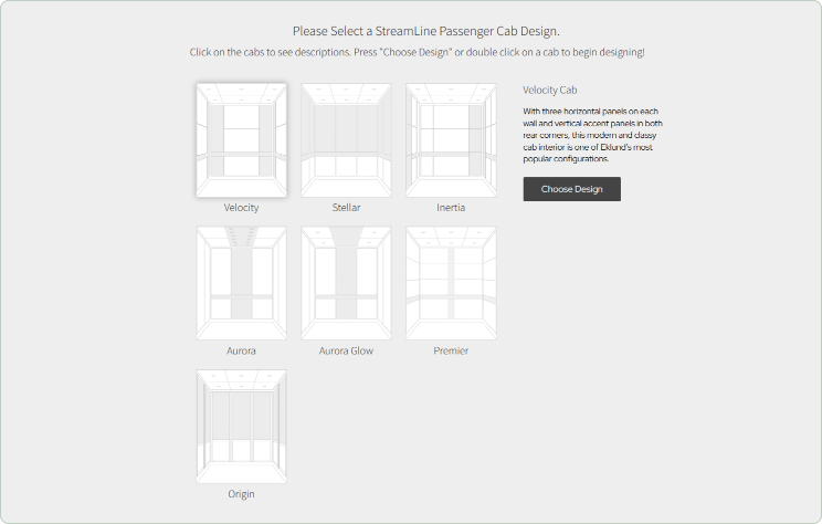 Enjoy the freedom to create the look you want for your elevator cab with our Cab Design Studio. Try out different elevator cab models and tweak your design, shape, finish, color and style to fit your building (and your budget).