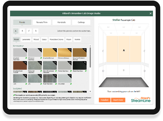 Eklund’s StreamLine Cab Design Studio is a virtual design tool that lets you experiment with cab configurations and finishes, and see them rendered right before your eyes! It’s easy to specify configurations and materials for both new construction and renovation projects. When you need a stand-out aesthetic faster, or have a tight budget, our unique StreamLine range makes it easy to get the best of both worlds from as little as $12,000 per elevator cab.