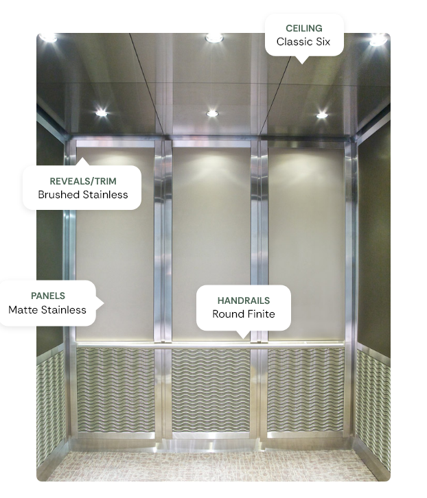 Choose from scores of finishes, materials, and patterns to customize your elevator cab’s walls, ceiling, and handrails to achieve that bespoke look without the exorbitant cost.